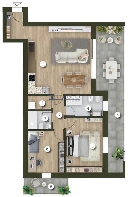 ingresso, soggiorno-angolo cottura di circa 35mq con uscita sul terrazzo abitabile di circa 25mq, disimpegno, 2 bagni, ripostiglio, camera matrimoniale e camera doppia con uscita sul poggiolo.