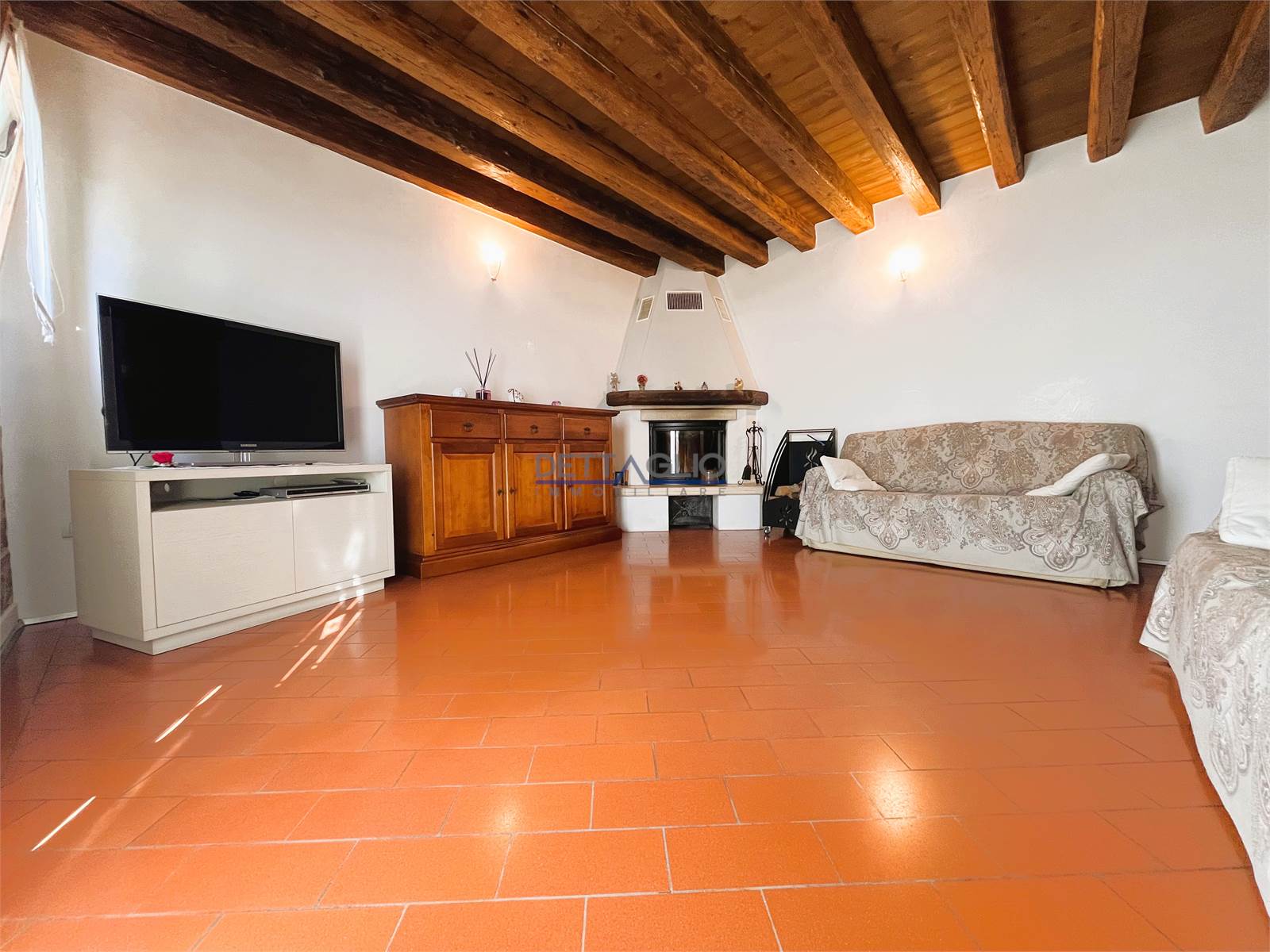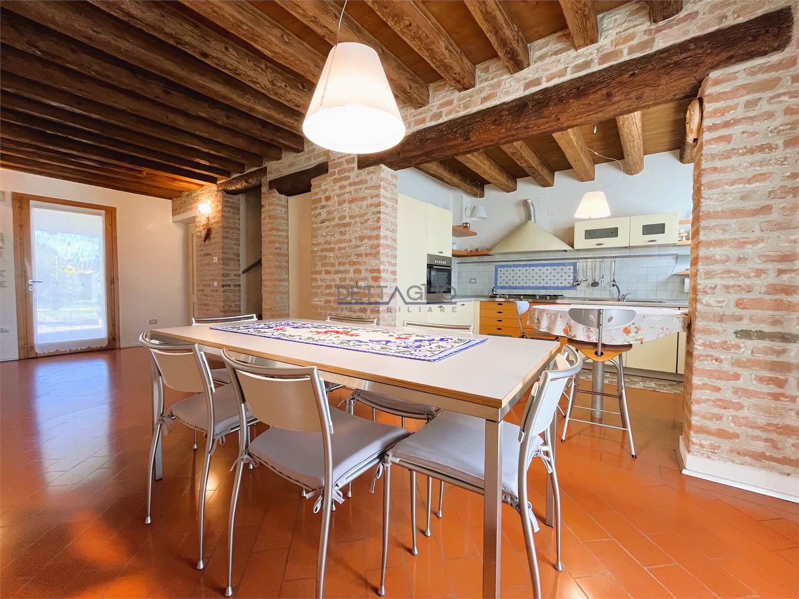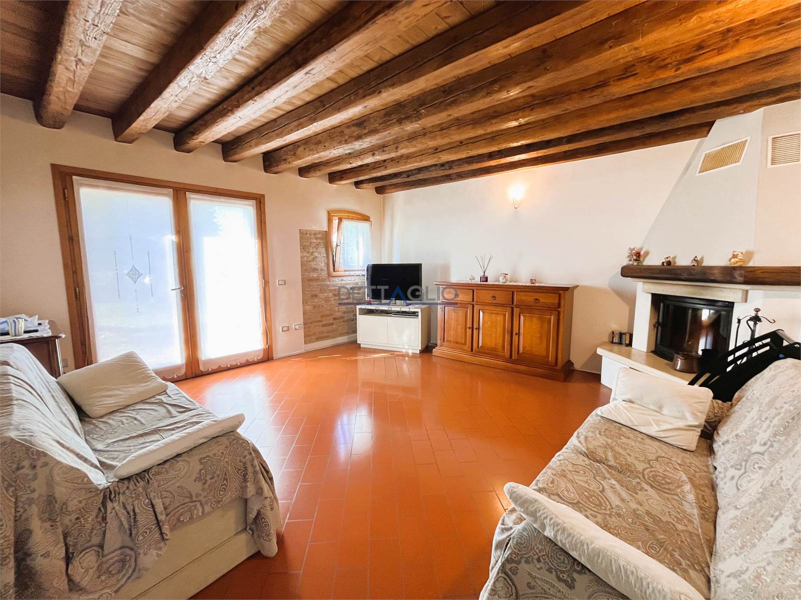 ampio portico di circa 30 mq, zona giorno di circa 50 mq divisa in ingresso-sala da pranzo con cucina semi abitabile e soggiorno con camino, bagno finestrato con box doccia, sottoscala, disimpegno, lavanderia/centrale termica e garage doppio.