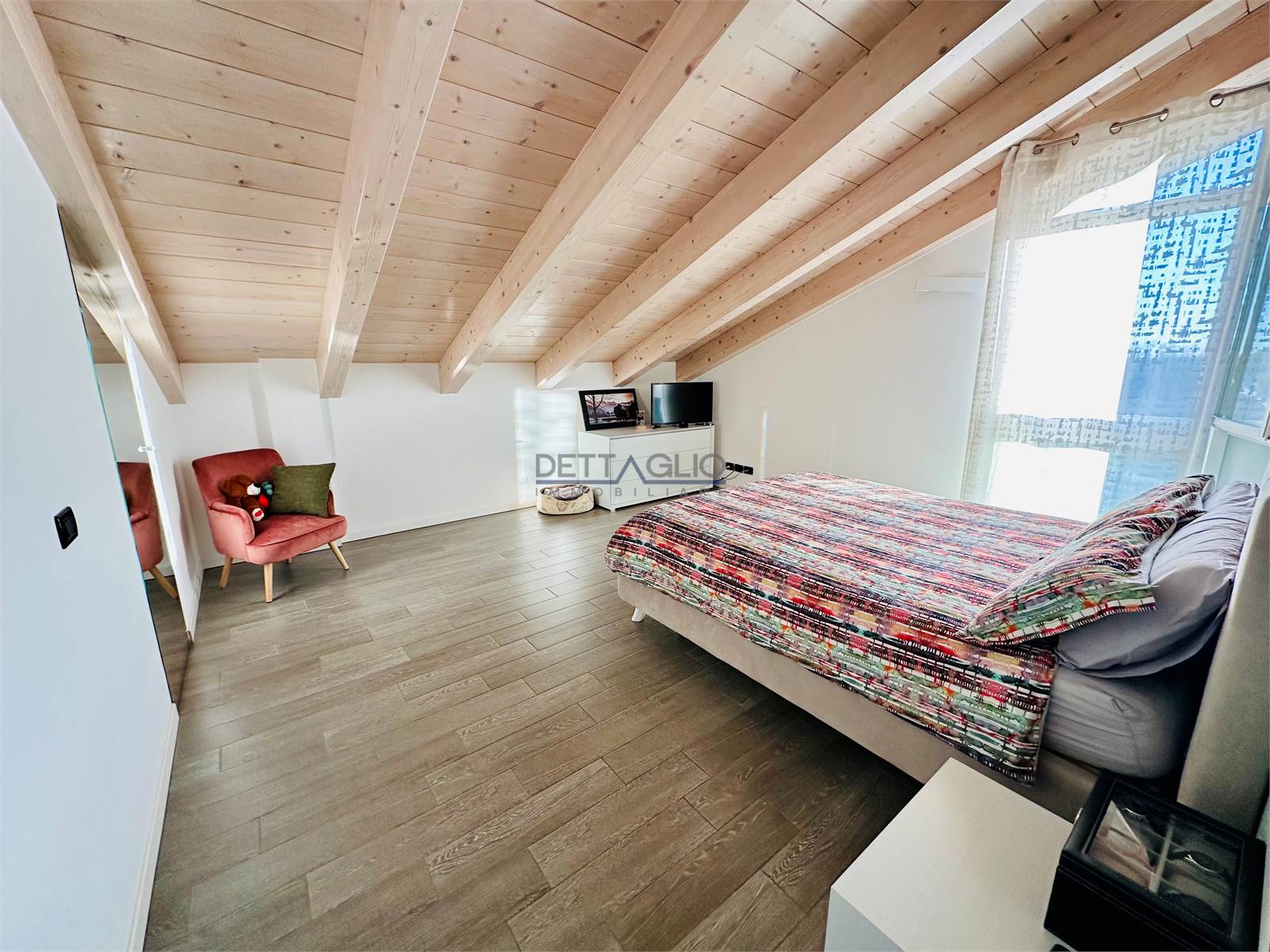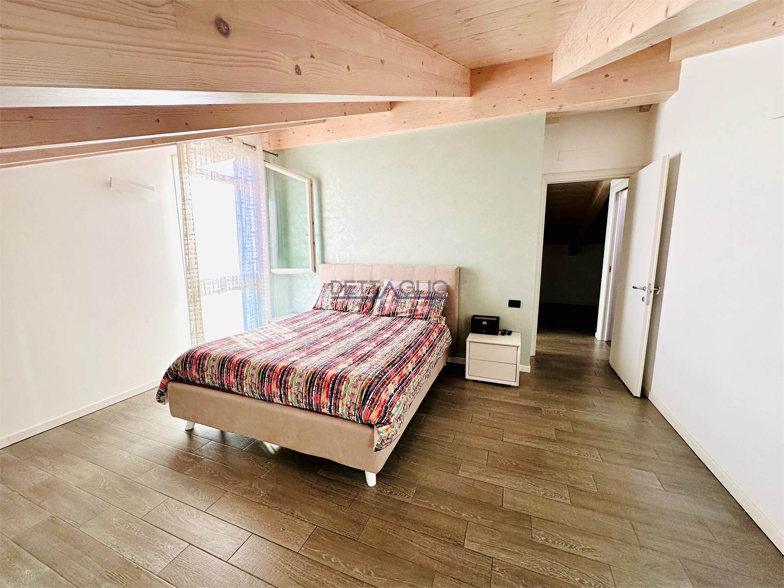 L'appartamento si compone al piano primo (senza ascensore) di: soggiorno con angolo cottura di circa 44 mq, disimpegno, bagno e ripostiglio/lavanderia, oltre a 3 piccoli poggioli; al piano secondo, travato a vista e con ottime altezze, di: ampio disimpegno attrezzabile a studio, bagno, camera singola e camera matrimoniale con cabina armadio.