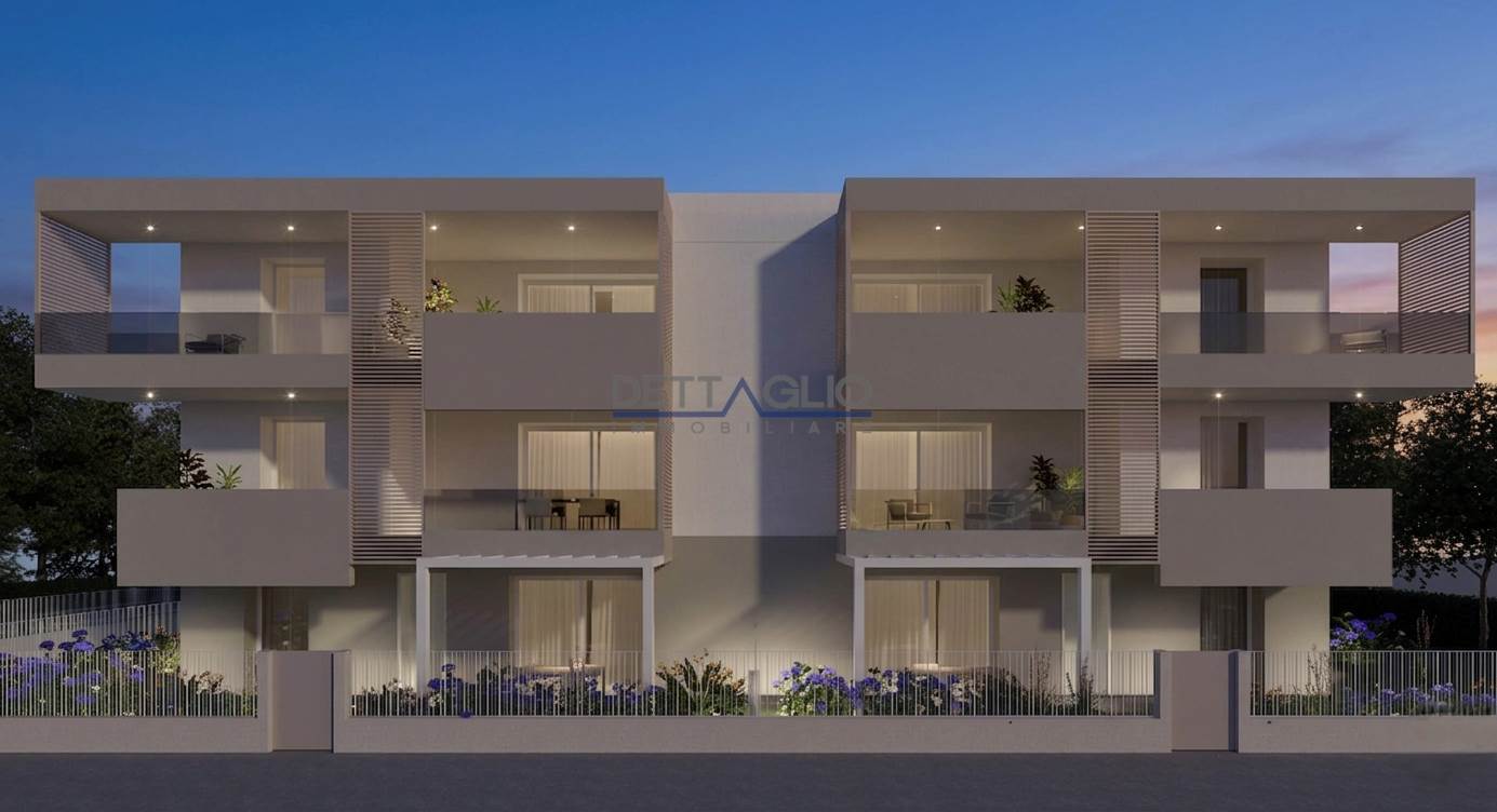 Gli appartamenti proposti si trovano al piano terra e sono composti da ingresso, soggiorno, cucina abitabile, disimpegno, ripostiglio, 3 camere di cui una matrimoniale, due bagni. La zona giorno può essere modificata in un unico ambiente open space. All'esterno troviamo l'ampio scoperto esclusivo che circonda l'abitazione. Garage doppio al piano interrato servito da ascensore per raggiungere il piano dell'abitazione.