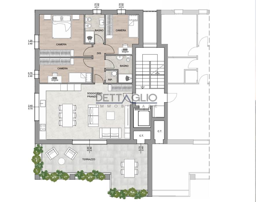 L'immobile si compone da grande zona living con affaccio tramite vetrate alla terrazza abitabile di 40mq.