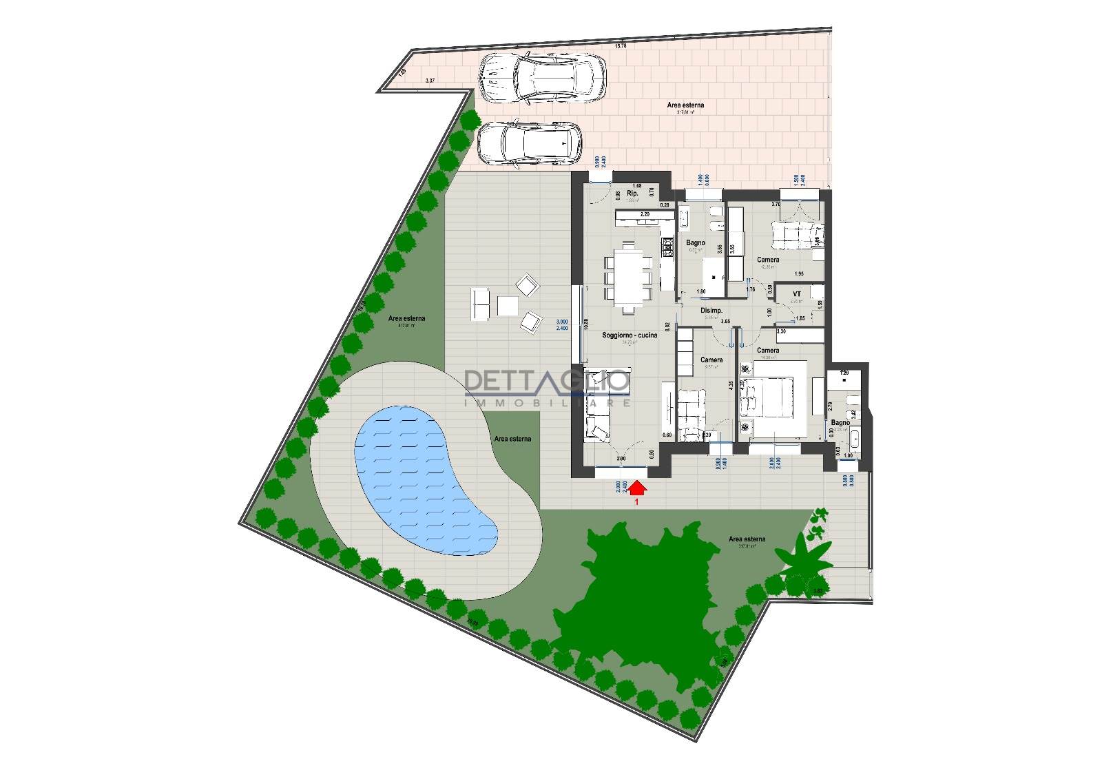 A completare questa proposta un ampio scoperto ottimamente esposto; il fabbricato è stato costruito in modo che non ci siano affacci dei piani superiori in corrispondenza del giardino di questa unità, quindi si può godere della parte esterna in totale privacy.
