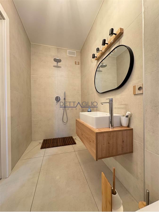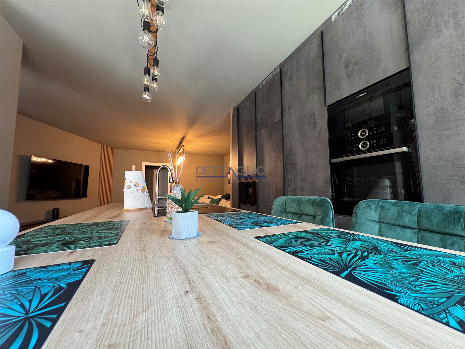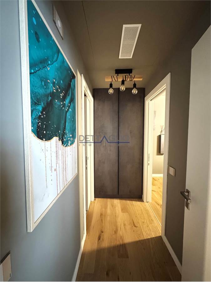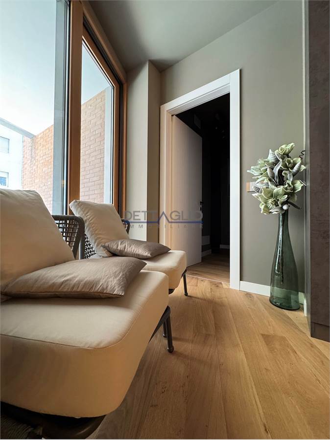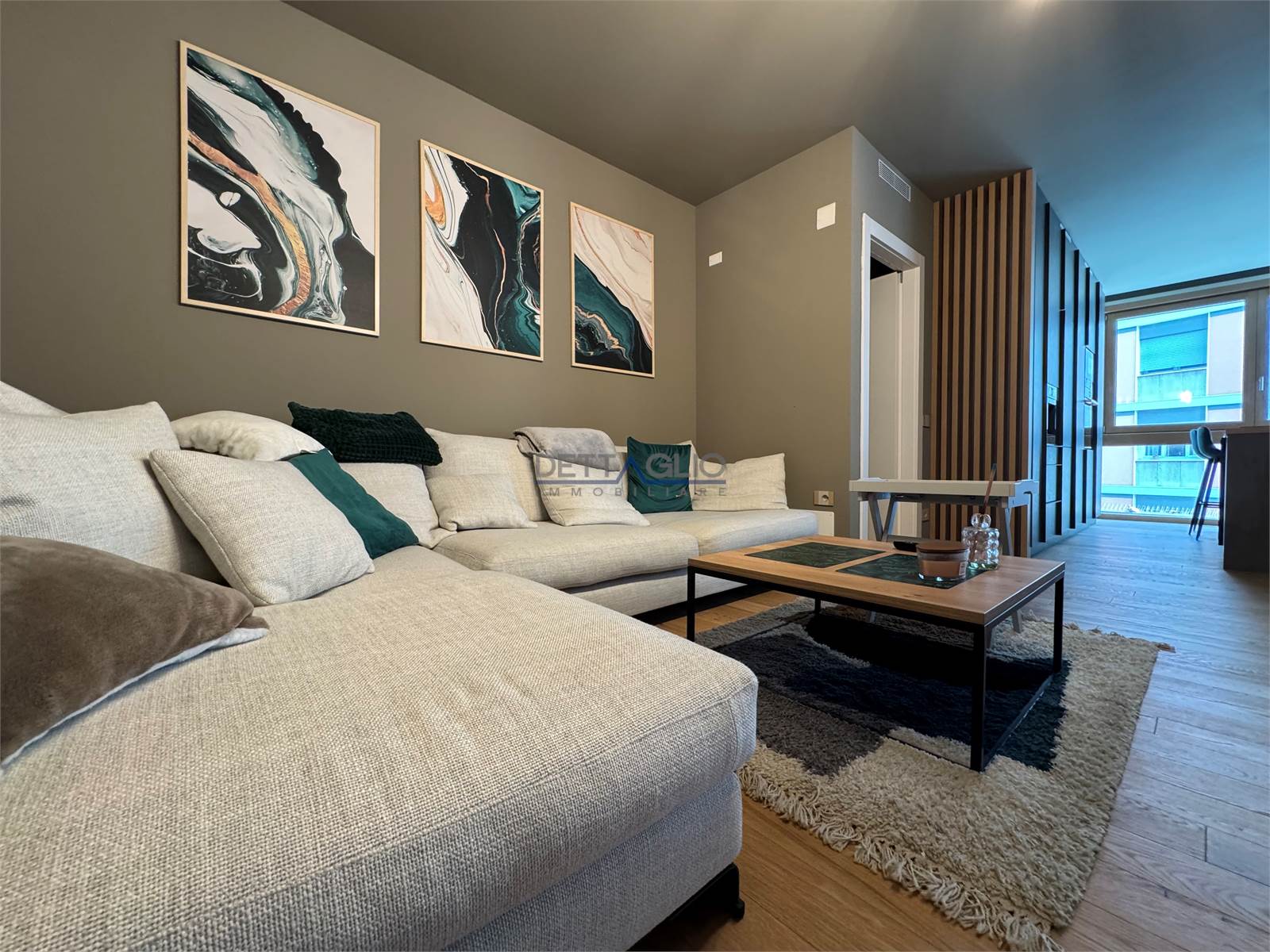 L'appartamento, che si contraddistingue per lo stile moderno ed elegante, è composto da un ingresso, un'ampia zona living con cucina a vista ed accesso al terrazzo, 2 camere matrimoniali e 2 bagni.