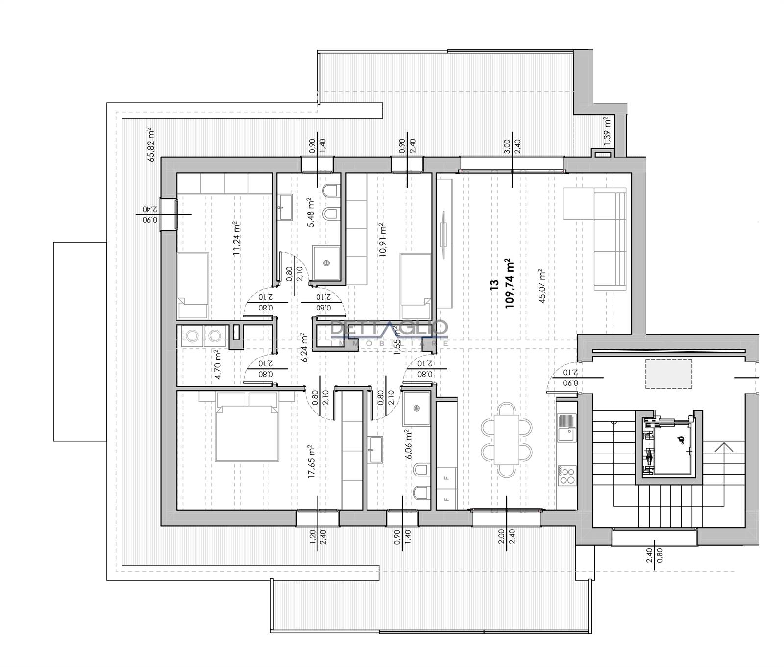L'appartamento che viene qui proposto è l'attico n.13, al quarto ed ultimo piano, composto da ingresso su ampia e luminosa zona giorno con doppia esposizione ad est/ovest, servita da terrazza di circa 70mq con vista panoramica che circonda l'intero attico, disimpegno, tre camere di cui una matrimoniale, due bagni, lavanderia, intelligente nicchia ad uso ripostiglio.